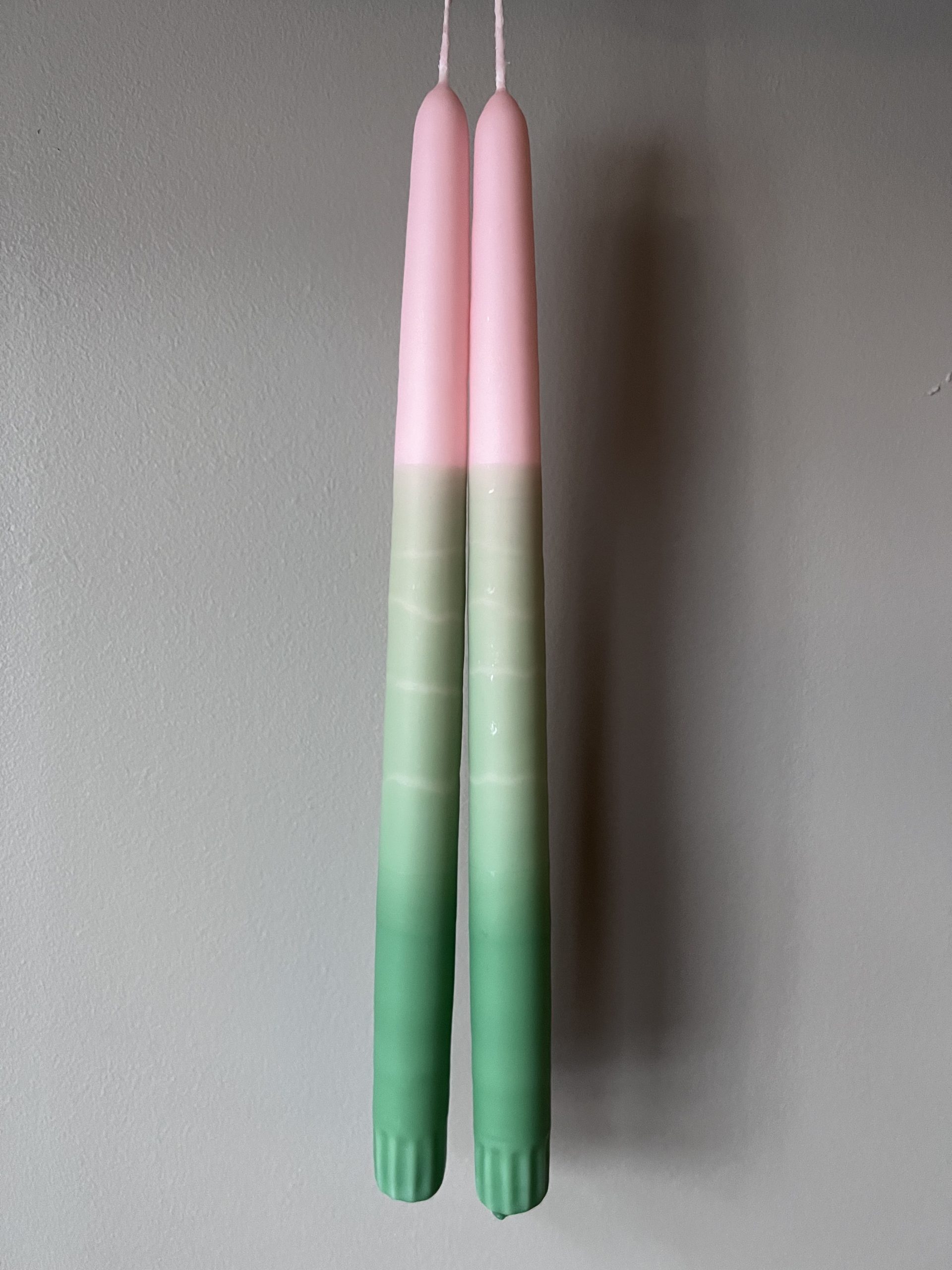 Ett handstöpt antikljuspar med riktigt fina brinnegenskaper. Lång brinntid! Här i en flerfärgad variant i grönt och rosa.