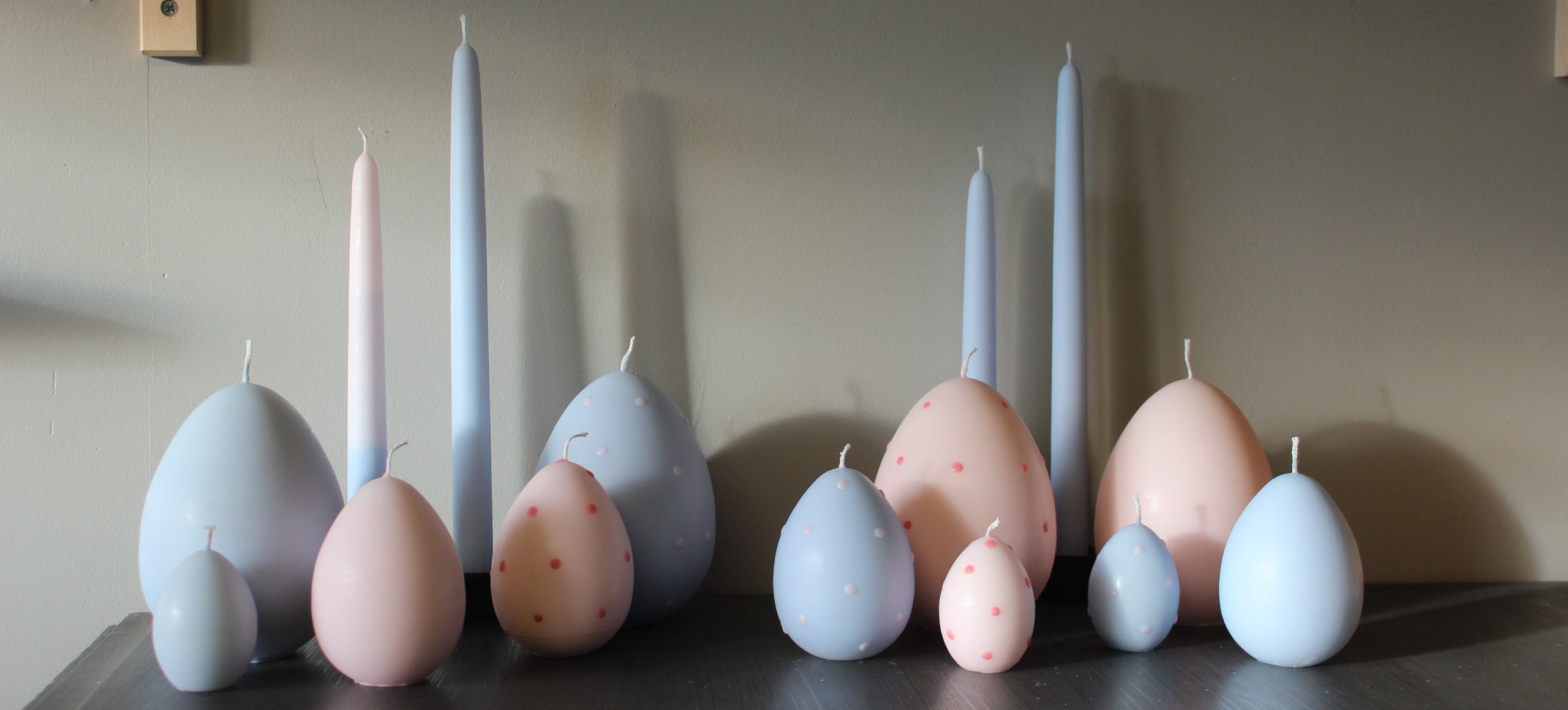 Här hittar du våra äggljus och andra våriga påskljus. Handstöpta antikljus i pastelliga färger. Stearinljus i form av ägg. Och andra ljus som kan passa en påskdukning.
